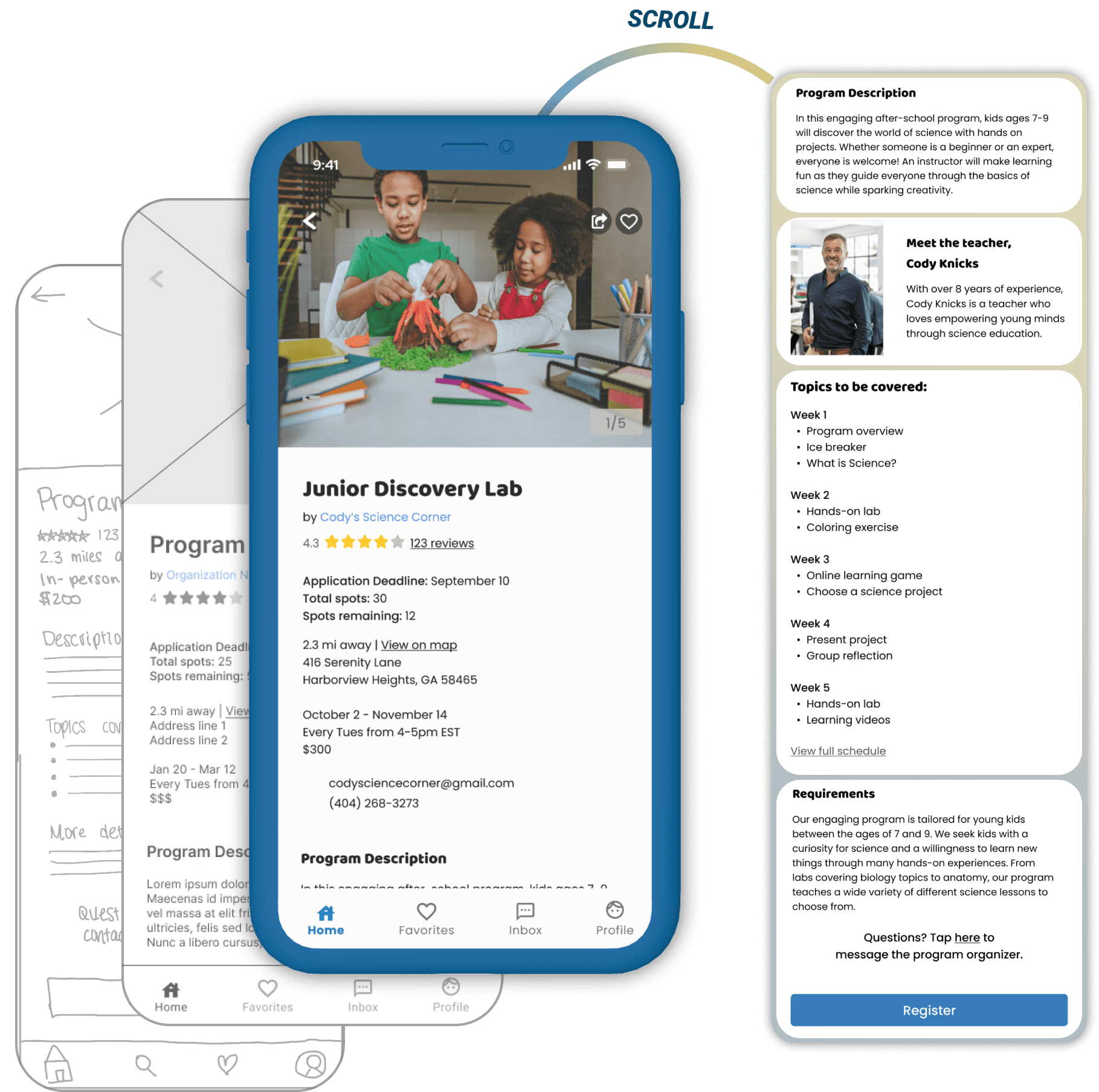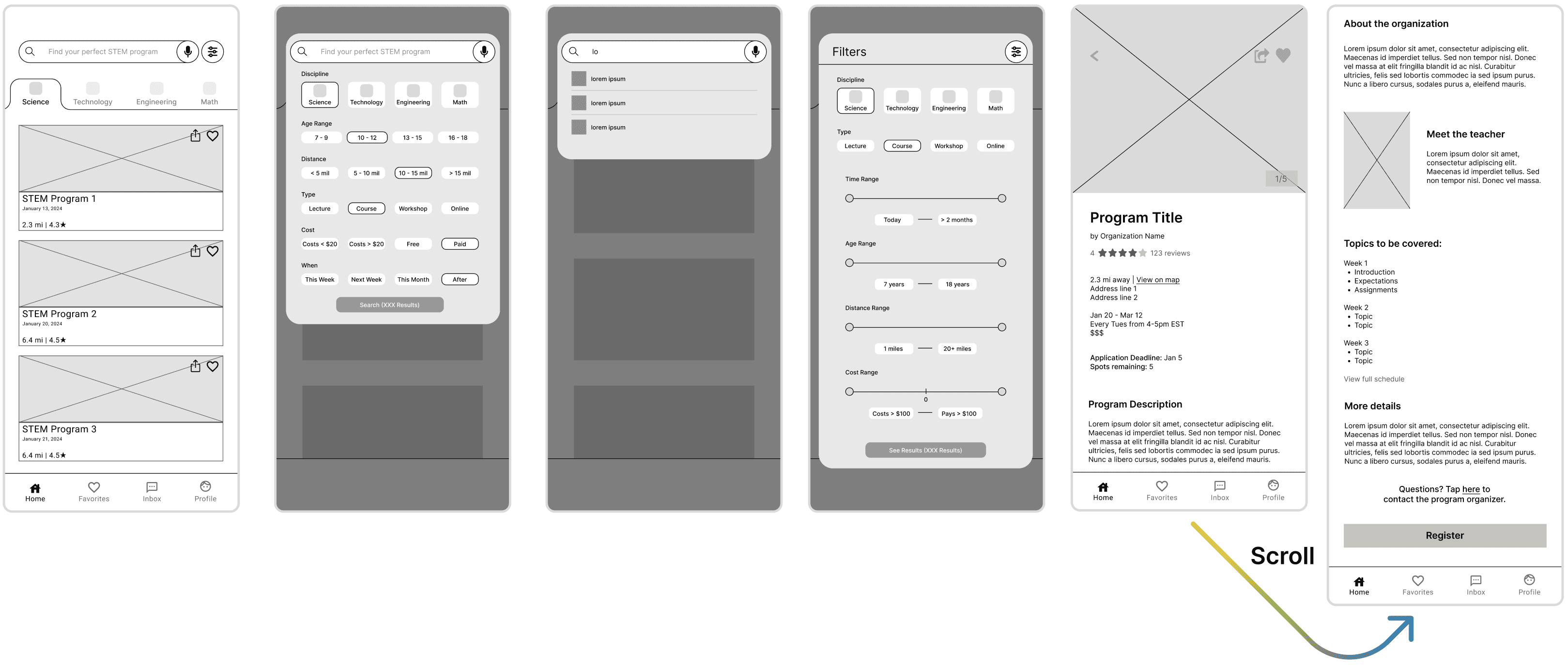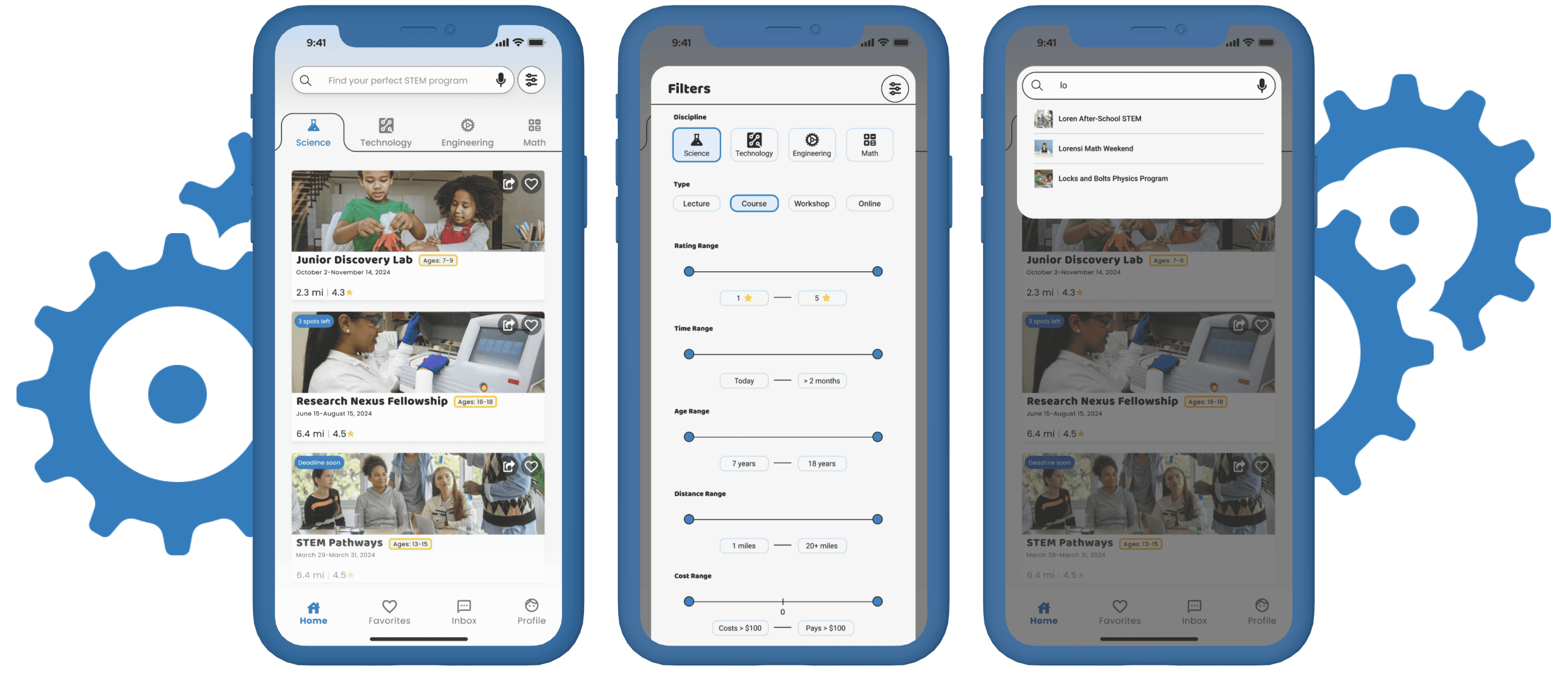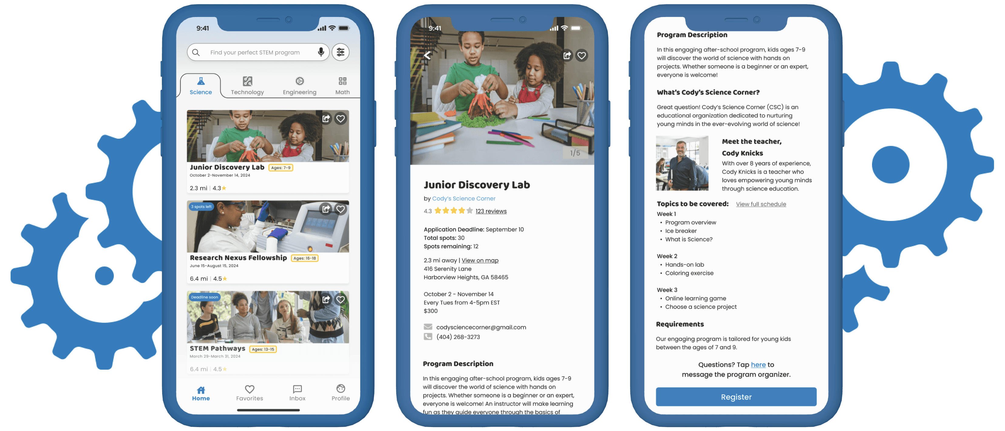 We were tasked with designing mobile app screens that allows guardians, educators, and K-12 students interested in STEM to search and register for vetted STEM programs in the Atlanta area.